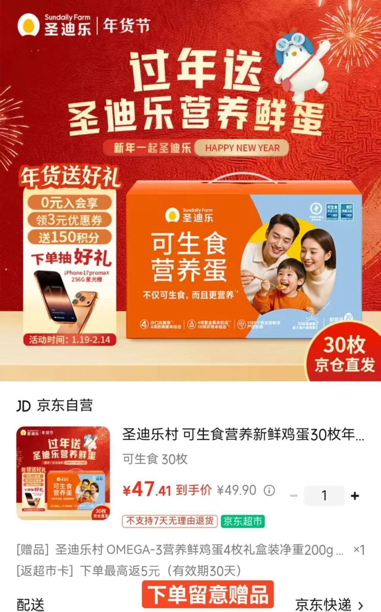自营 圣迪乐村 鲜鸡蛋30枚 49.9亓包U,Plus付47.4亓好单发报员2026年02月15日 17:550举报 ——春节不打烊——【自营】圣迪乐村 鲜鸡蛋30枚https://u.jd.com/lrYh0gY 49.9亓包U,Plus付47.4亓*贈5超市卡 贈儿童营养蛋4枚*折1.2亓/枚 自吃送礼都不错复制文案