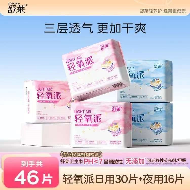 舒莱 轻氧派卫生巾日夜46片 19.9亓,贴身柔软 不打烊