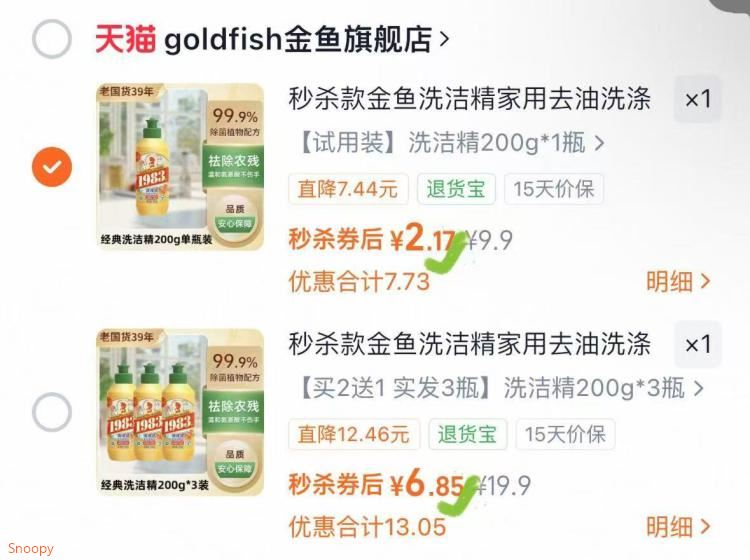 金鱼洗涤灵200g2元.1 3瓶的也合算,到手6.8 好单发报员 2026年02月20日 19:04 0 举报 金鱼洗涤灵200g2元.13瓶的也合算,到手6.8https://m.tb.cn/h.7yh4deG 复制文案