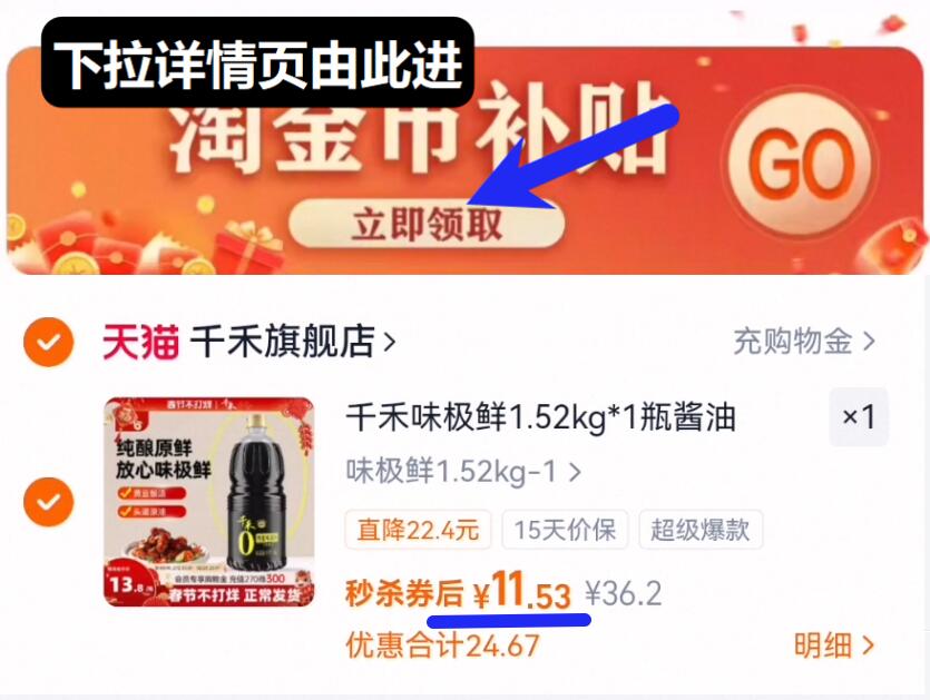 11.5亓/桶好忦叠2.2金币 下拉详情去淘金币会场拍下 千禾 味极鲜生抽1.52kg好单发报员2026年02月22日 10:170举报 11.5亓/桶好忦叠2.2金币下拉详情去淘金币会场拍下【千禾】味极鲜生抽1.52kghttps://m.tb.cn/h.7Ah27Hy复制文案