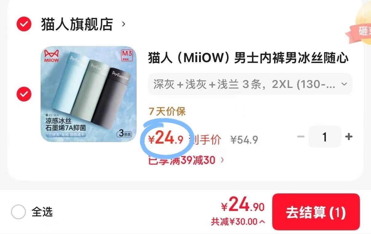 猫人男士平角内裤 7A级抑菌 3条装【24.9】