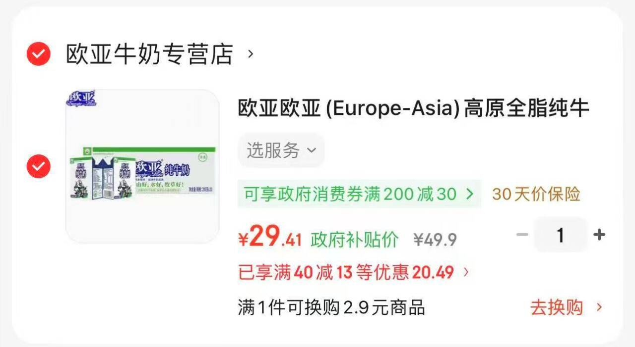 欧亚 纯牛奶 200g*20元29.4