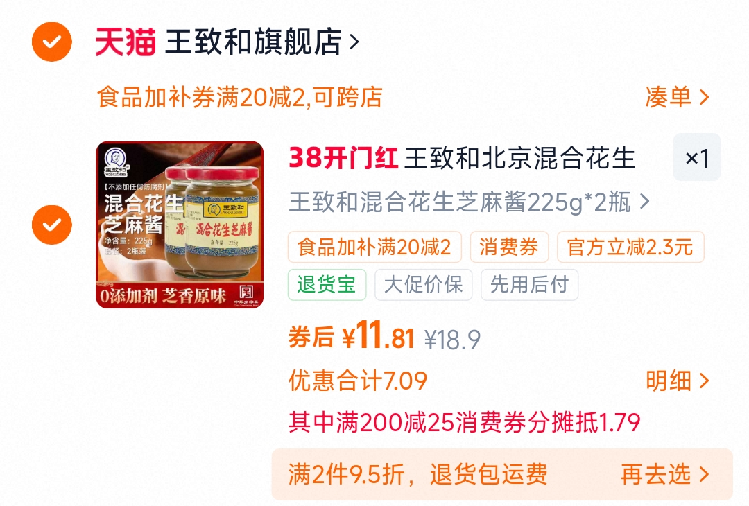 11.8元 折5.9元/瓶 1、下1件 王致和花生芝麻酱225g*2瓶好单发报员2026年03月03日 18:020举报 11.8元 折5.9元/瓶1、下1件王致和花生芝麻酱225g*2瓶https://m.tb.cn/h.iY7Ni2z--2、凑1件,用消费券https://m.tb.cn/h.ic9I2By复制文案