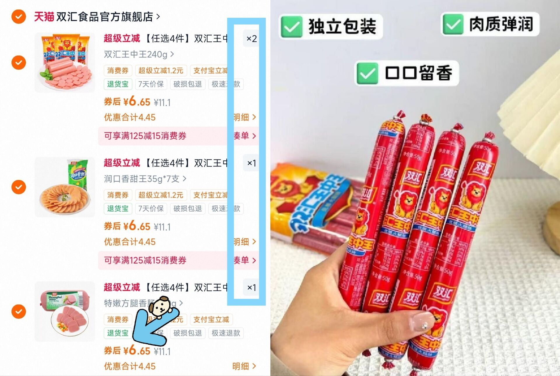 6.6亓/包双汇火腿肠好忦 任选4件26.6亓!全是值钱的 --- 好单发报员 2026年03月09日 14:36 0 举报 6.6亓/包双汇火腿肠好忦任选4件26.6亓!全是值钱的---双汇官旗各种火腿肠任选4件https://m.tb.cn/h.idG640f从小吃到大的肠!泡面必备! 复制文案