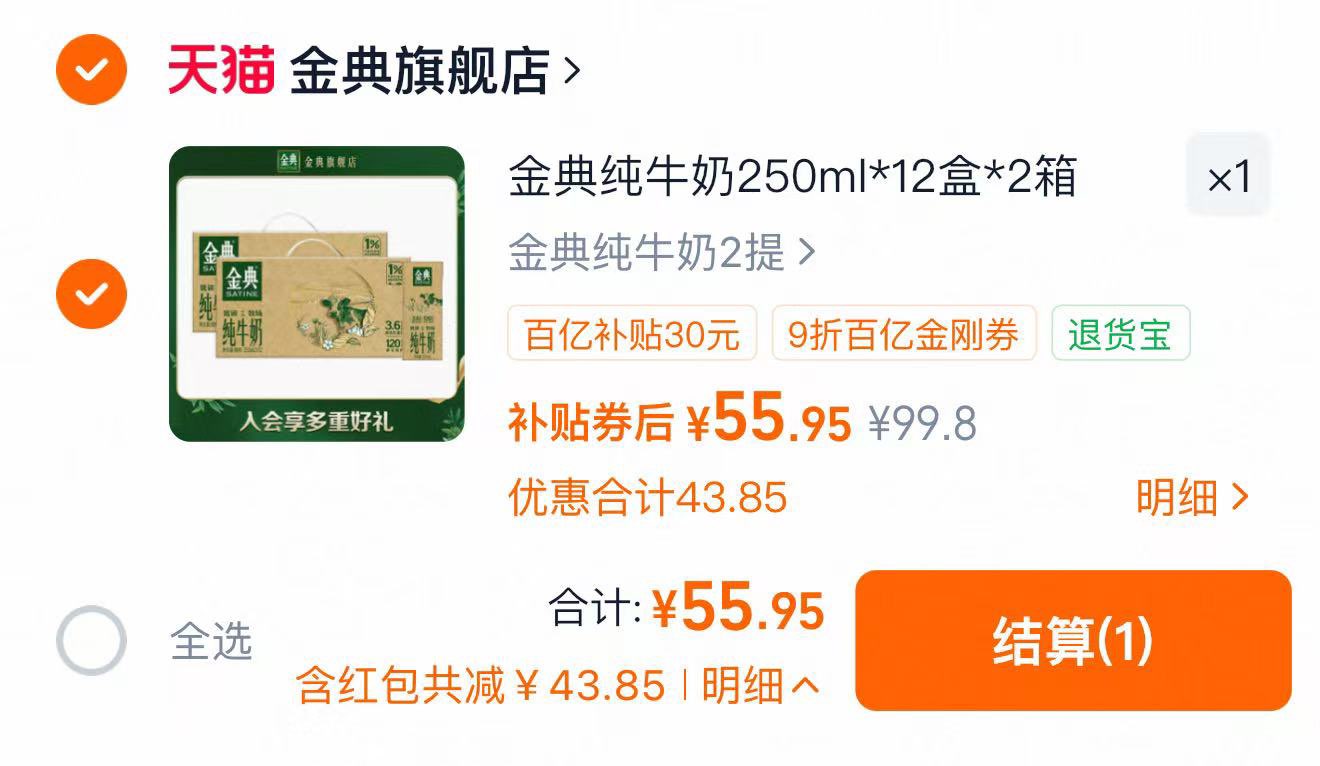 标题下领取9折金刚券 点右上角···再点击桃金币 找到商品加购 叠限量礼金好单发报员2026年03月11日 12:060举报 标题下领取9折金刚券点右上角···再点击桃金币找到商品加购 叠限量礼金拍下55.9亓 折2.32亓/盒伊利金典纯牛奶12盒*2箱https://m.tb.cn/h.ieBB2YD复制文案