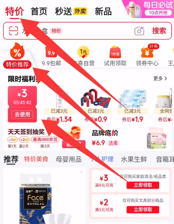 京东App 顶部 切换到特价 点进去可领3.9-3