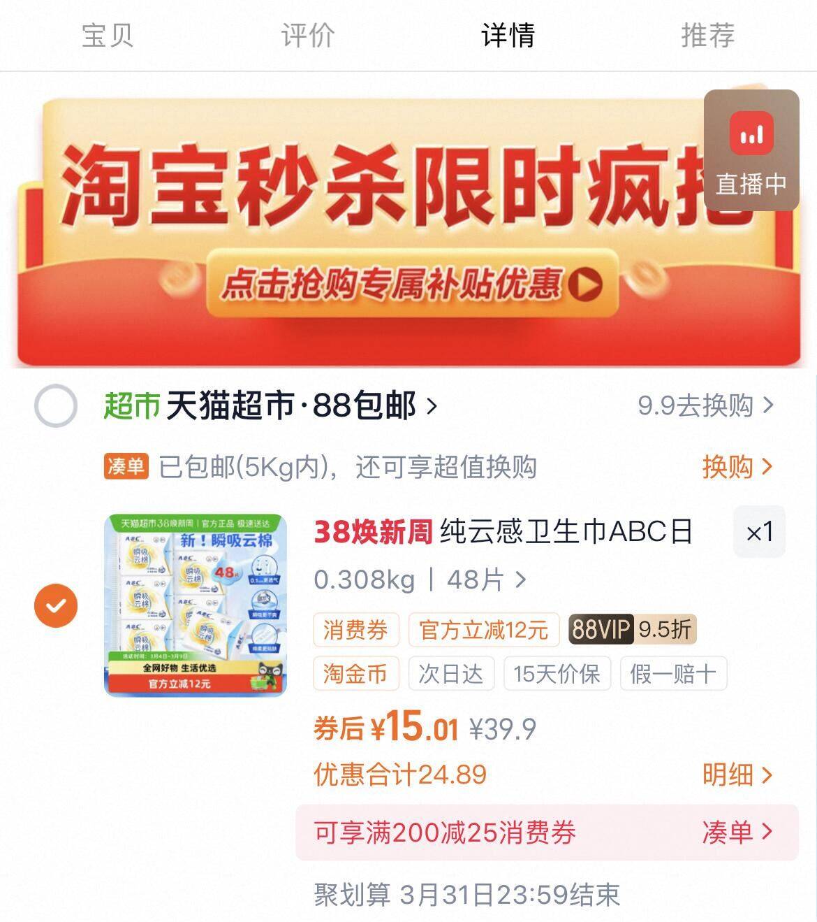 15亓下拉详情拍 ABC纯云感日用卫生巾48片