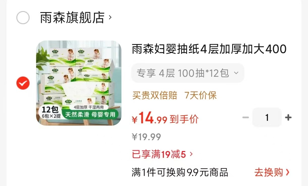 雨森 妇婴抽纸4层加厚加大400张 100抽*12包【14.9】