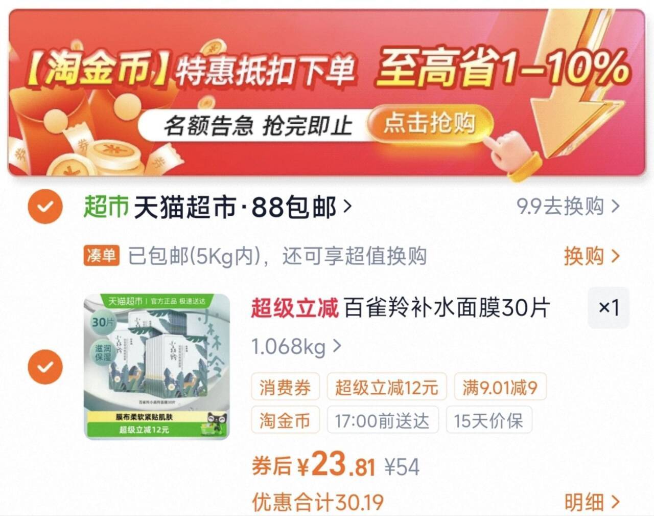 23.8元下拉拍 百雀羚小森羚面膜30片