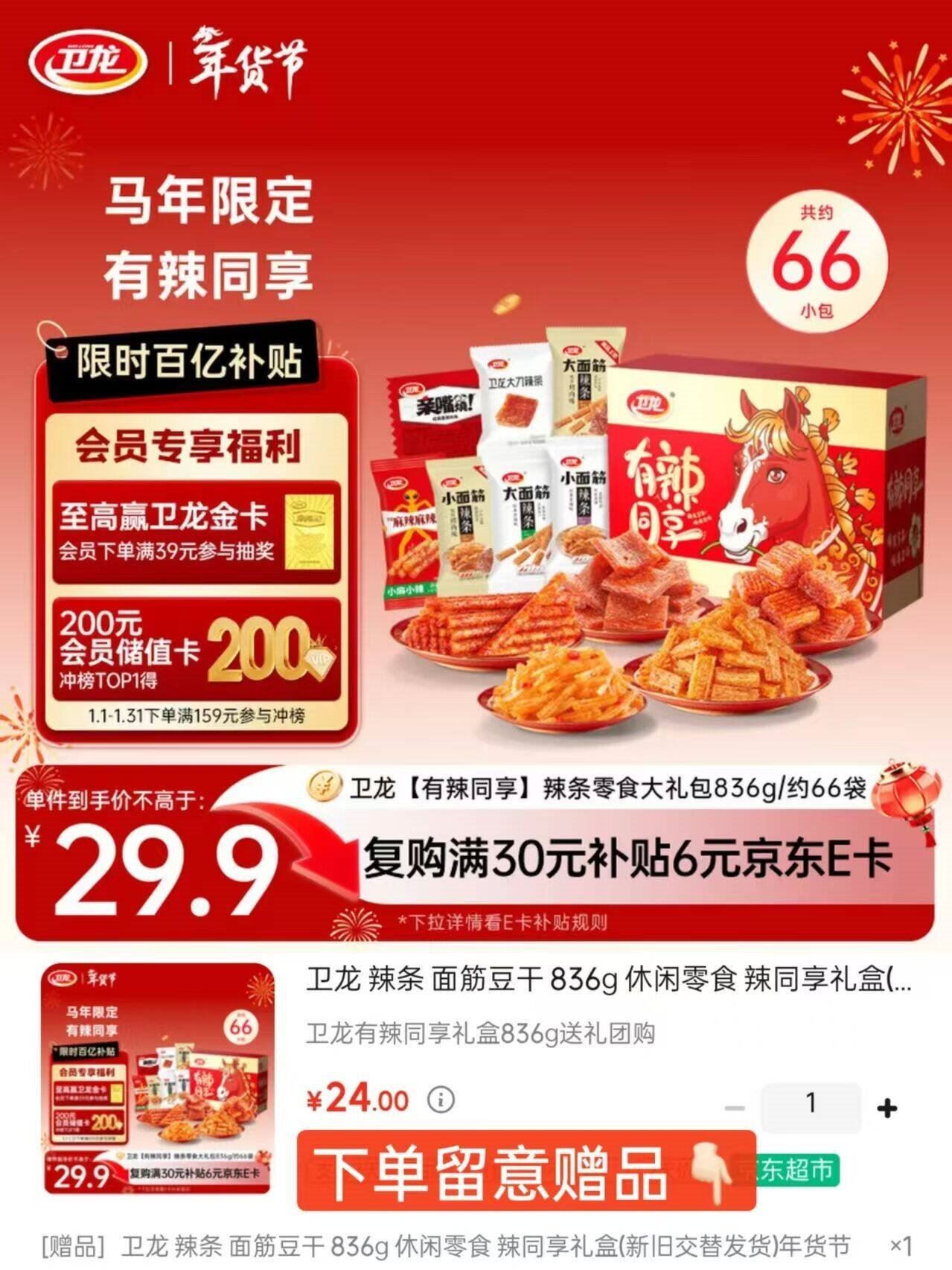 块快卫龙shen忦 自营 卫龙 有辣同享辣条836g 24元 运費好单发报员2026年03月16日 19:010举报 ——块快卫龙shen忦——【自营】卫龙 有辣同享辣条836ghttps://u.jd.com/NOVSQgK24元 运費,Plus无限包U*贈同歀辣条836g 才12元/件*解馋过瘾 礼盒包装 送礼也行复制文案