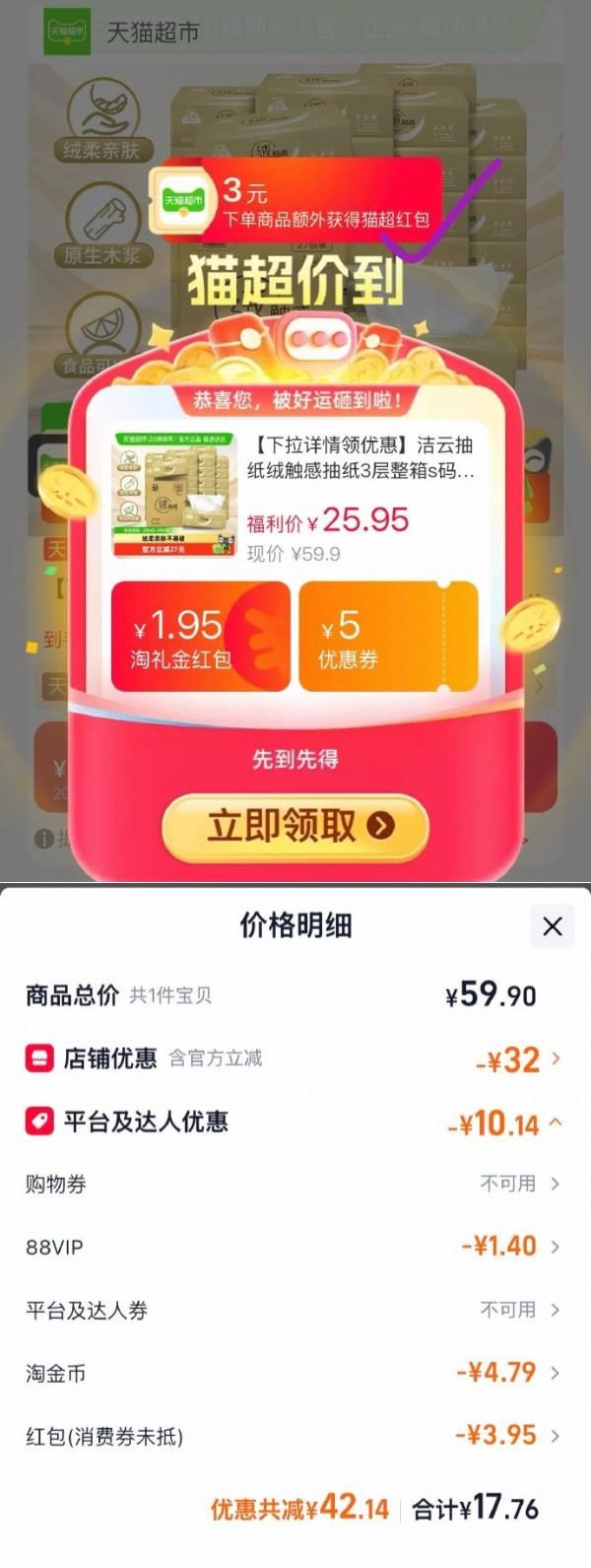(图一显示下单返3红包,相当于到手14.76元)