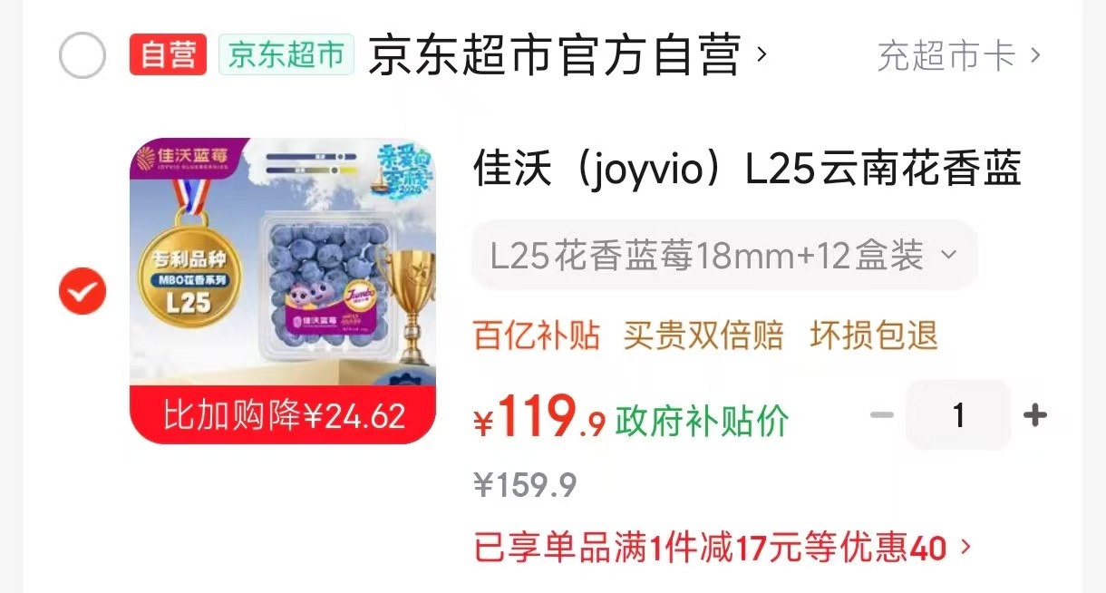 佳沃 (joyvio)L25云南花香蓝莓18mm 12盒约125g/盒【119】