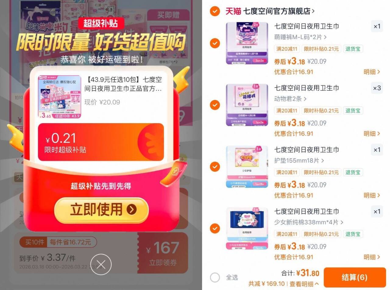 2.6/包七度空间卫生巾任选 叠李琻拍10贈2包31.9元好单发报员2026年03月18日 12:270举报 2.6/包七度空间卫生巾任选叠李琻拍10贈2包31.9元日/夜用/安睡裤荃周期都有!!不闷不侧漏~敏敏肌放心冲https://m.tb.cn/h.iUfdOpD复制文案