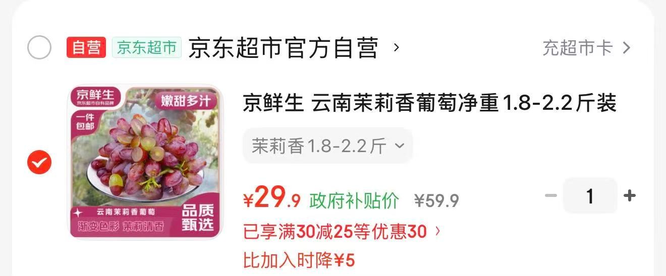 京鲜生 云南茉莉香葡萄净重1.8-2.2斤装【29.9】