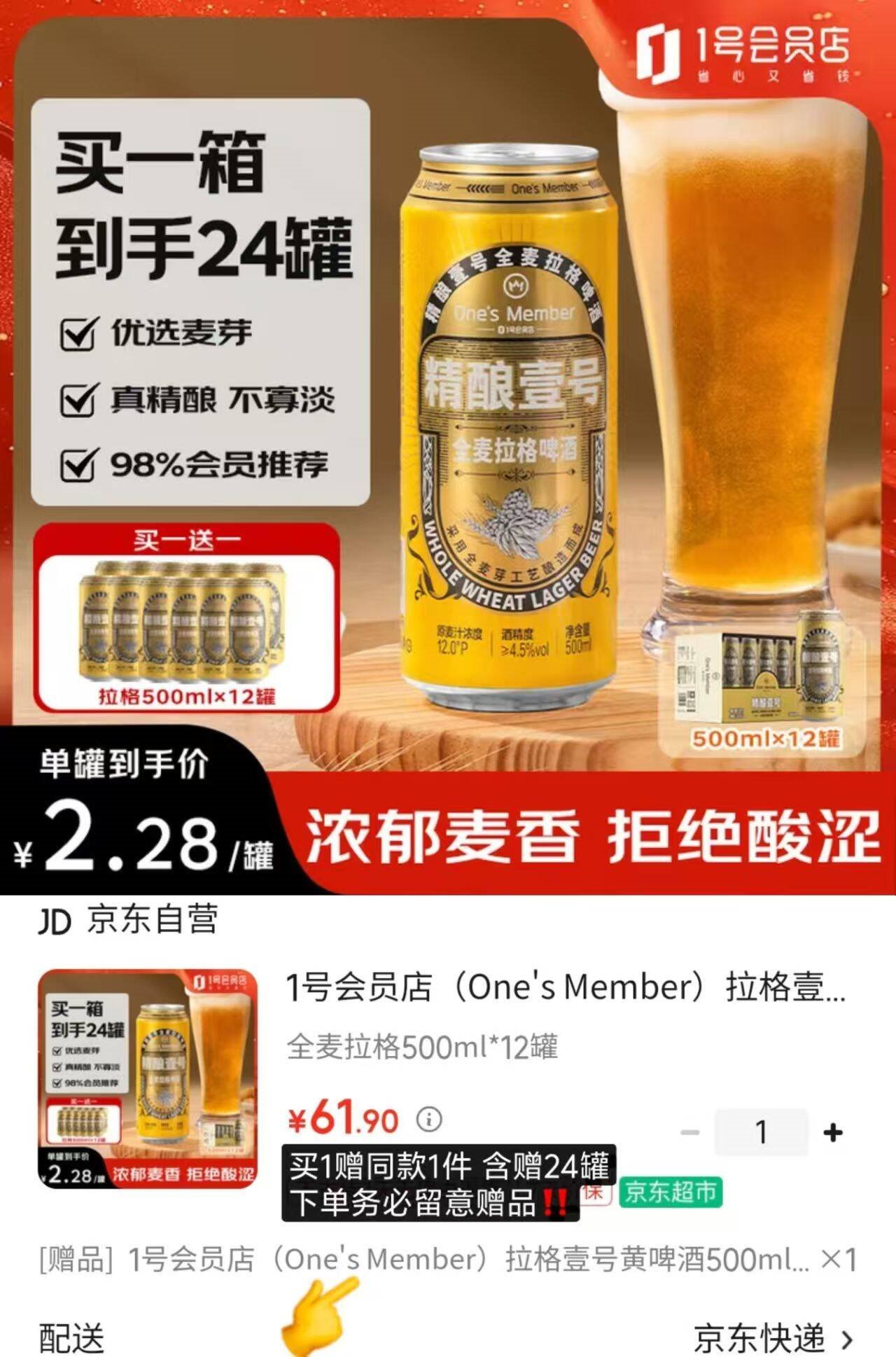 精酿壹号啤酒500ml*24罐