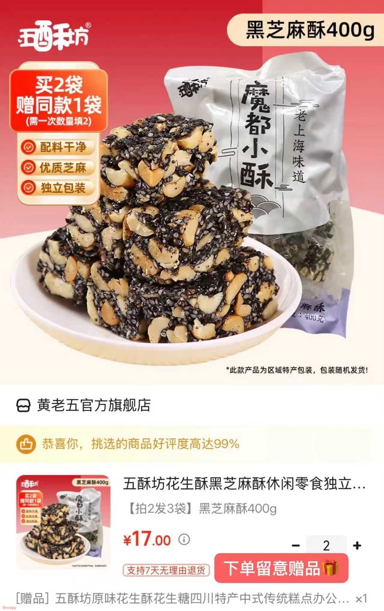 黄老五 黑芝麻酥花生酥400g