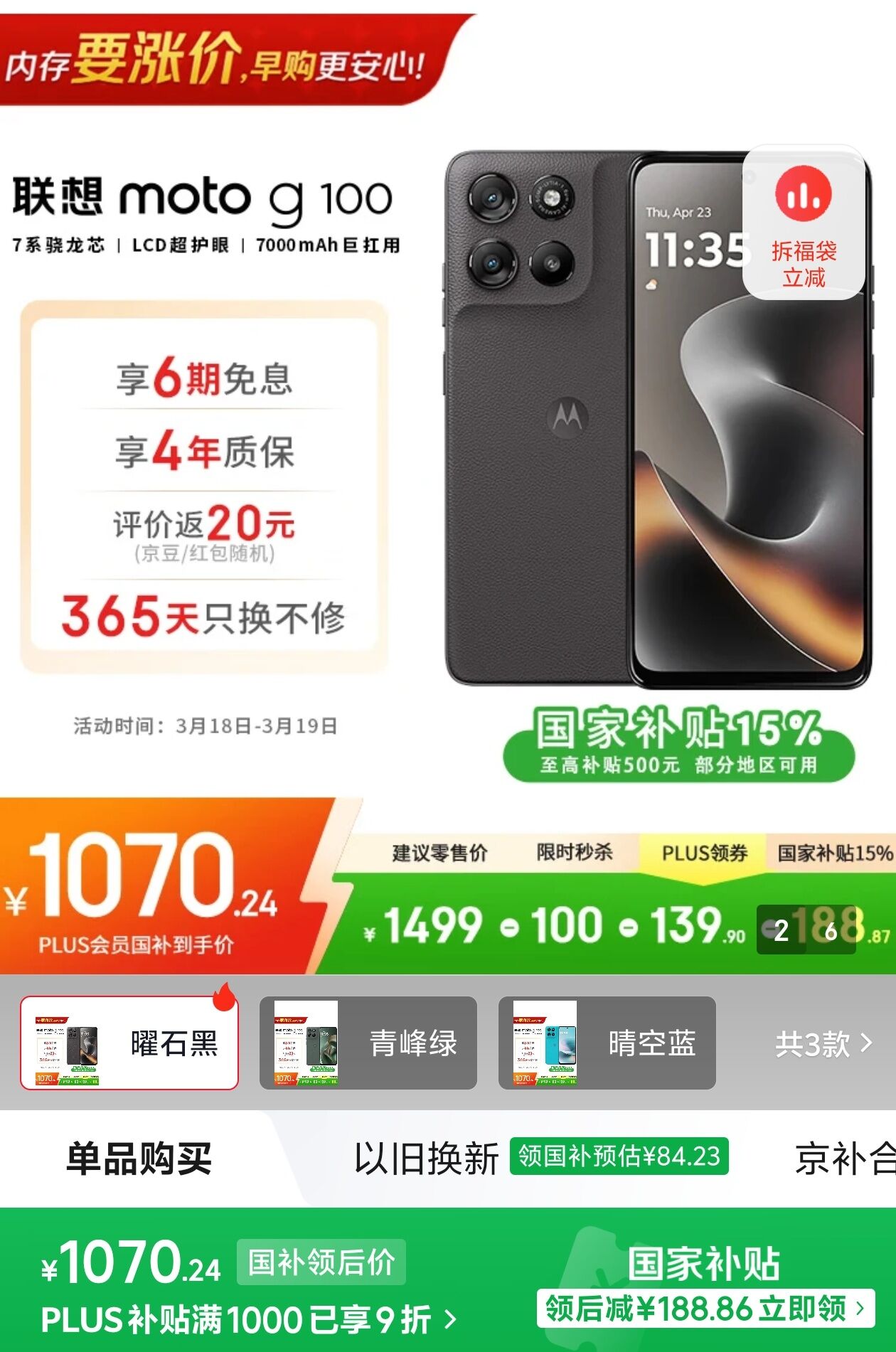 摩托罗拉G100 12G 256G 元嗮單阪20 plus领9折 好单发报员 2026年03月19日 16:29 0 举报 摩托罗拉G100 12G 256G元嗮單阪20,国补后1050https://u.jd.com/NghhTxiplus领9折https://u.jd.com/Ngh4ano 复制文案