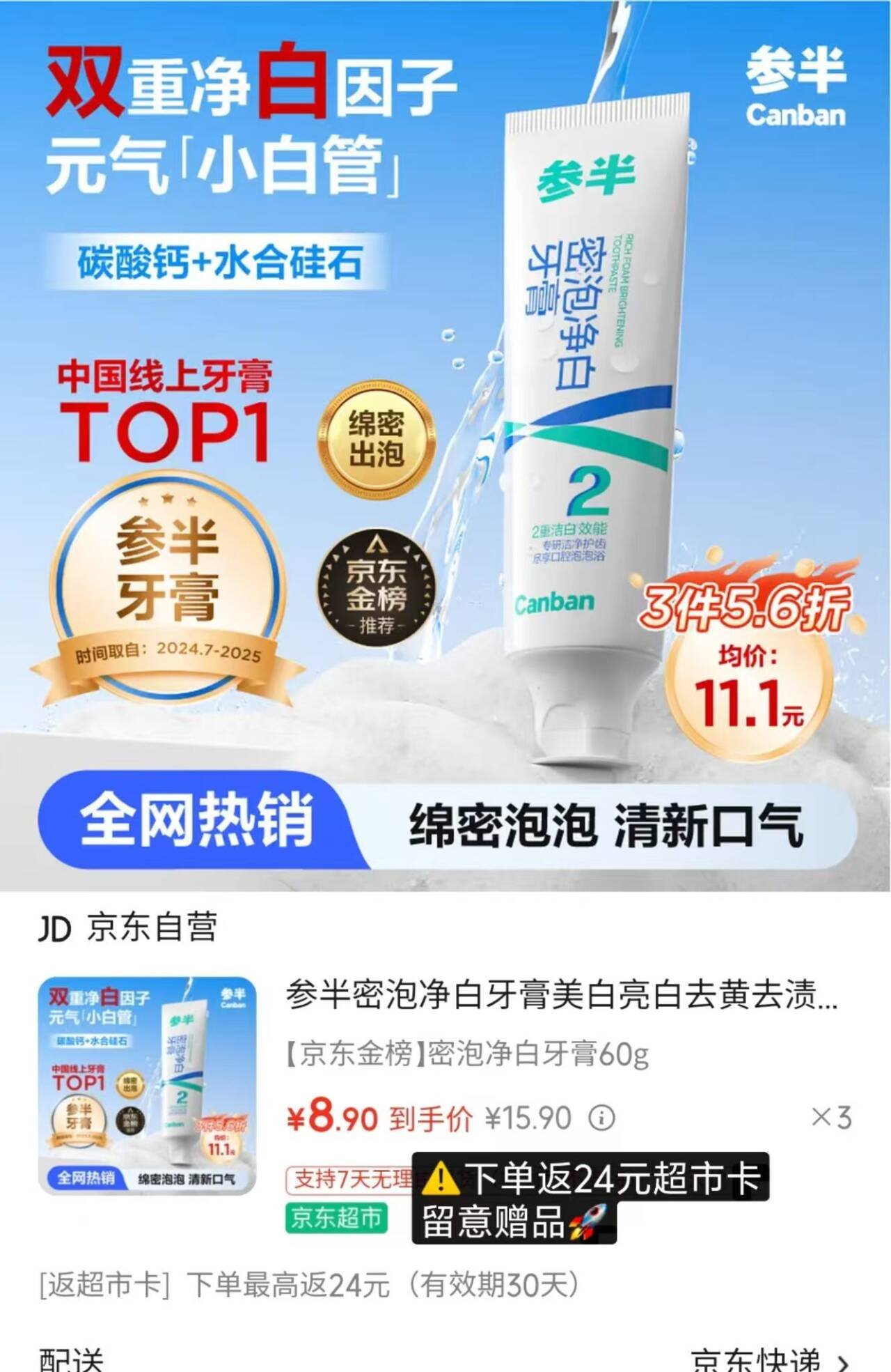 【自营】参半 密泡净白牙膏60g