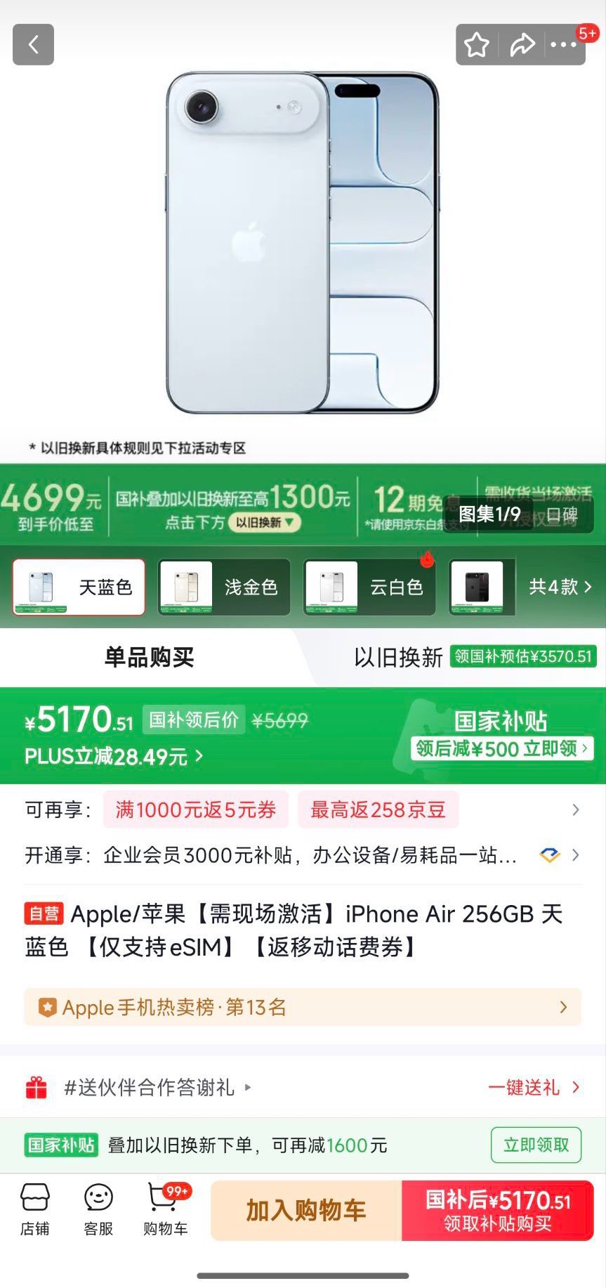 iPhone Air 256GB【5170】湖北江苏山西河北江西等地区guo补