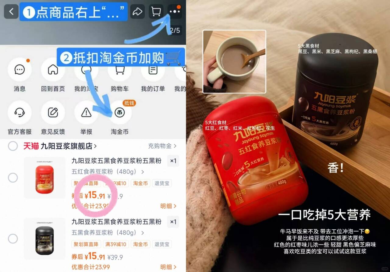速15.9元九阳五黑五红任选 叠金币拍食养豆浆粉480g 早红养晚黑养添加超健康好单发报员2026年03月20日 10:180举报 速15.9元九阳五黑五红任选叠金币拍食养豆浆粉480ghttps://m.tb.cn/h.igCF4uY-早红养晚黑养添加超健康限量礼金预计很快手慢复制文案