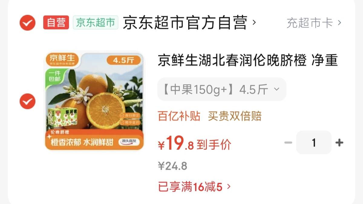 京鲜生湖北春润伦晚橙 4.5 斤 19.9元好单发报员2026年03月26日 17:340举报 包u 京鲜生湖北春润伦晚橙19.9元净重4.5斤挂果长达14个月,口感极佳https://u.jd.com/cOyvNbK复制文案