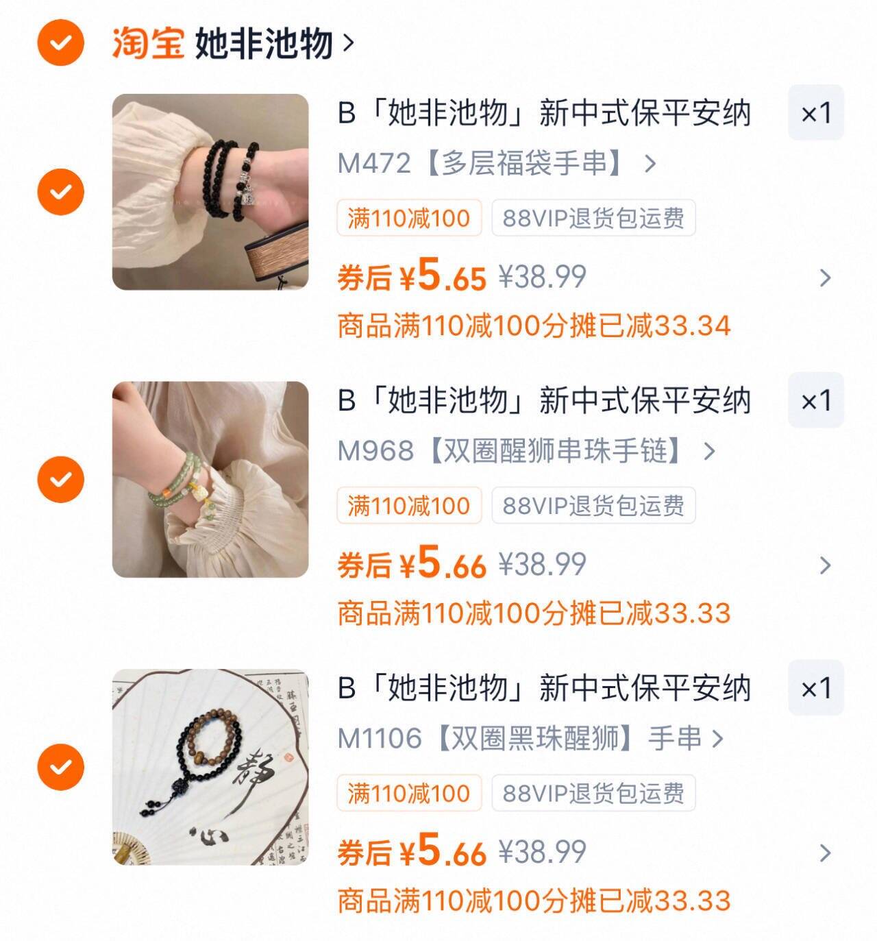 她非池物 新中式保平安手串 3 件 16.9元