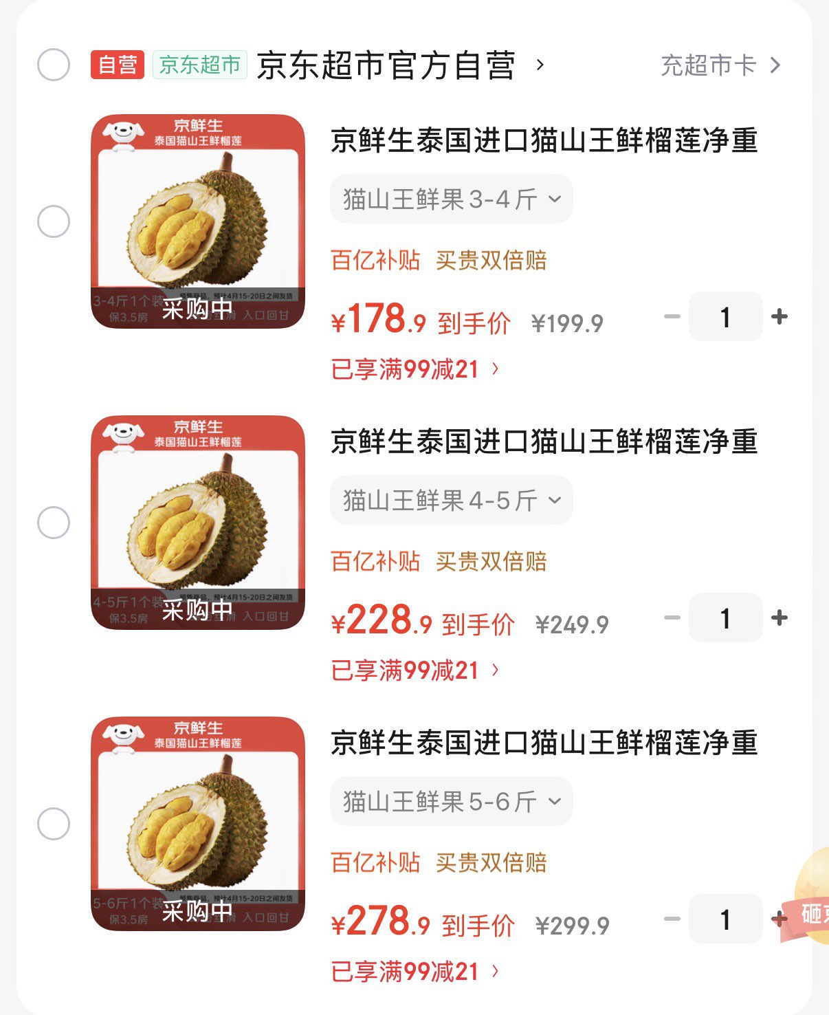京鲜生 泰国猫山王鲜榴莲