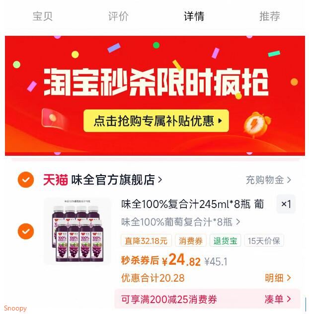 味全果汁 8瓶 24.8元好单发报员2026年03月28日 23:050举报 速 3元/瓶味全果汁味全果汁245ml*8瓶24.8元下滑详情,到秒杀页面去拍https://m.tb.cn/h.iio48ci复制文案