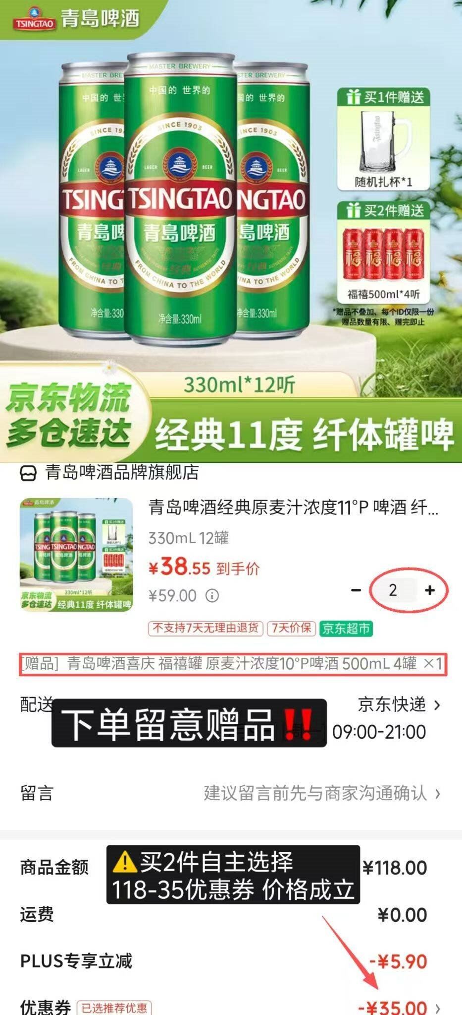 青岛啤酒经典11°P 330ml*12罐 买2件83元,Plus实付77.1元好单发报员2026年03月30日 09:570举报 ——青岛啤酒发車——青岛 经典11°P 330ml*12罐https://u.jd.com/cOA10JZ 买2件83元,Plus实付77.1元*下単贈青岛福禧500ml*4听*含贈28罐 折2.7/罐 家中常备复制文案