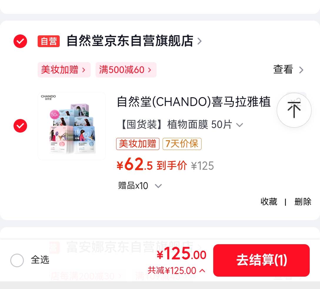 自然堂面膜50片 拍2件 赠10片 1.1元/片