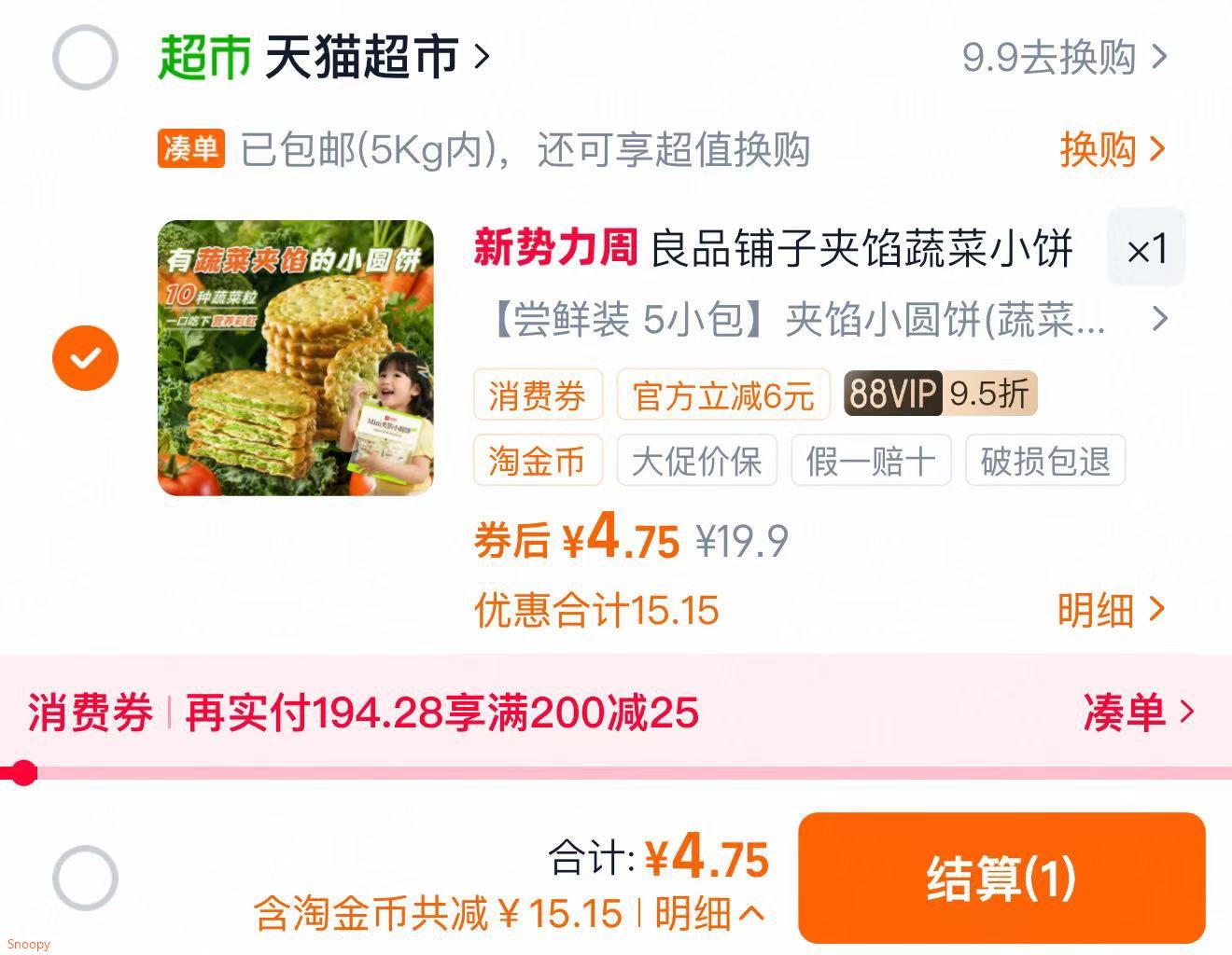 良品铺子蔬菜味小圆饼小饼干225g 拍尝鲜装5小包 4.75元好单发报员2026年03月31日 17:370举报 点右上角···再点击桃金币找到商品加购 拍尝鲜装5小包大部分地区城市价 叠限量礼金vip拍下4.75元 折0.95元/包良品铺子蔬菜味小圆饼小饼干225ghttps://m.tb.cn/h.ijjWO8r复制文案