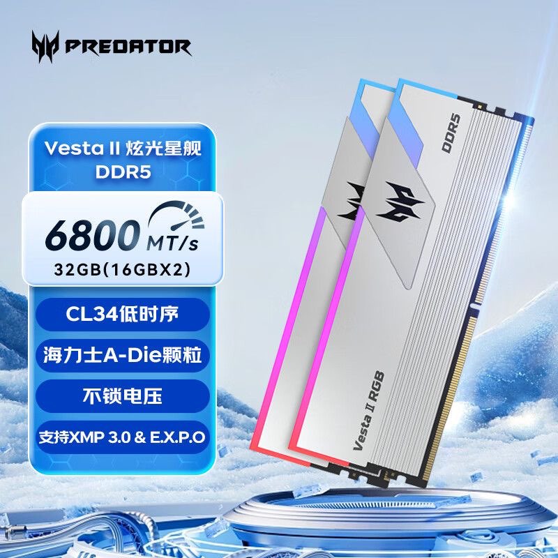 【2499】宏碁 掠夺者炫光星舰DDR5 6800 C34 32GB(16Gx2) Adie 银色内存条