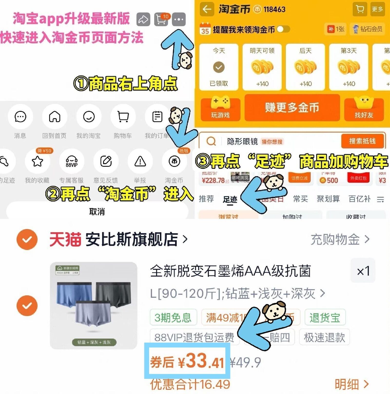 ①如图点右上角3个点 选淘金币