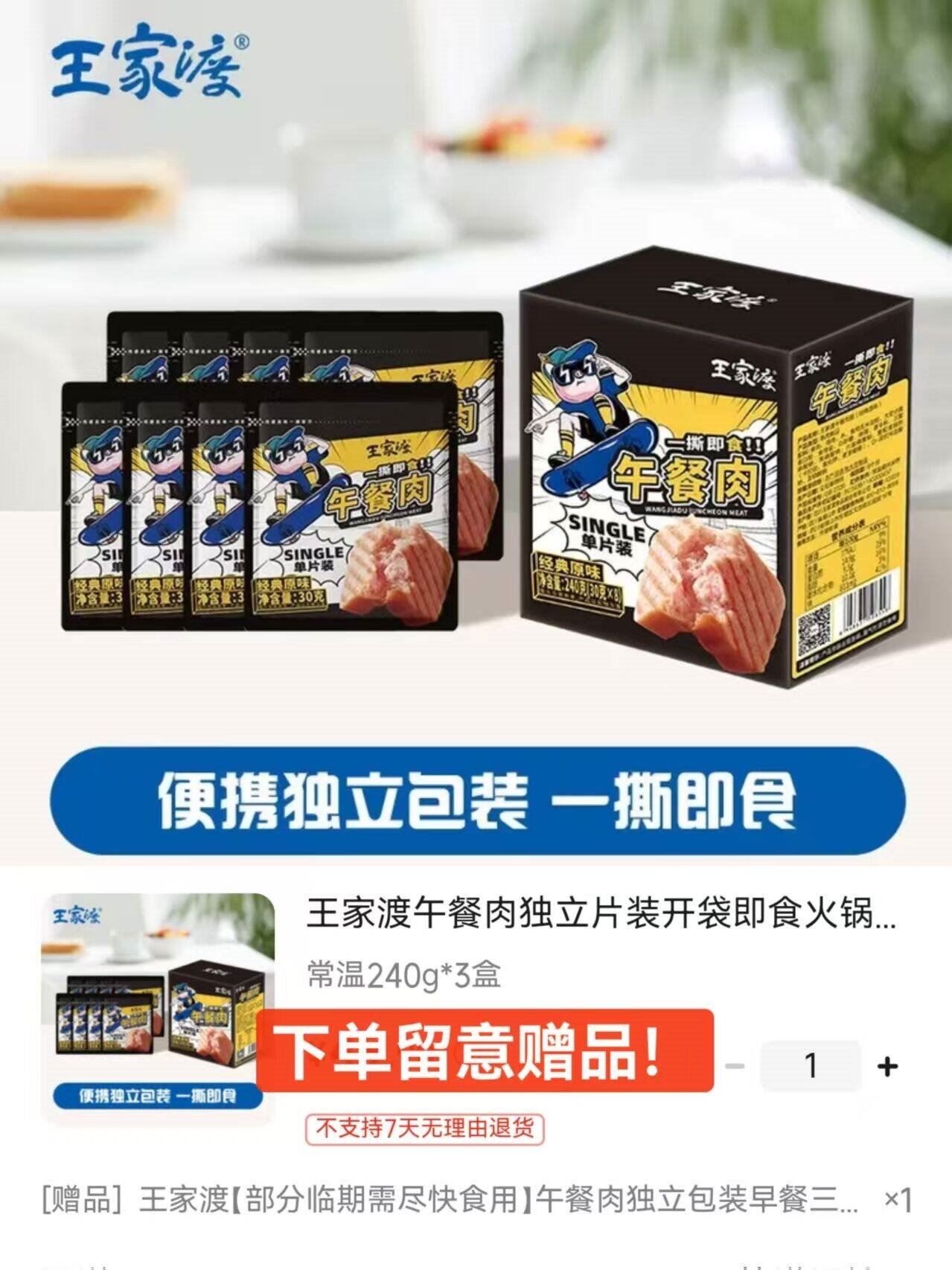 王家渡即食午餐肉240g*3盒 39.9元,赠同款*1发报员Z2026年04月09日 10:360举报 ——午餐肉限时加贈 ——王家渡 即食午餐肉240g*3盒 https://u.jd.com/j1sV5f7 39.9元,贈同歀*1 才9.9/盒*平时3盒也是这忦 独立包装*吃早餐或火锅 都是绝佳选择复制文案