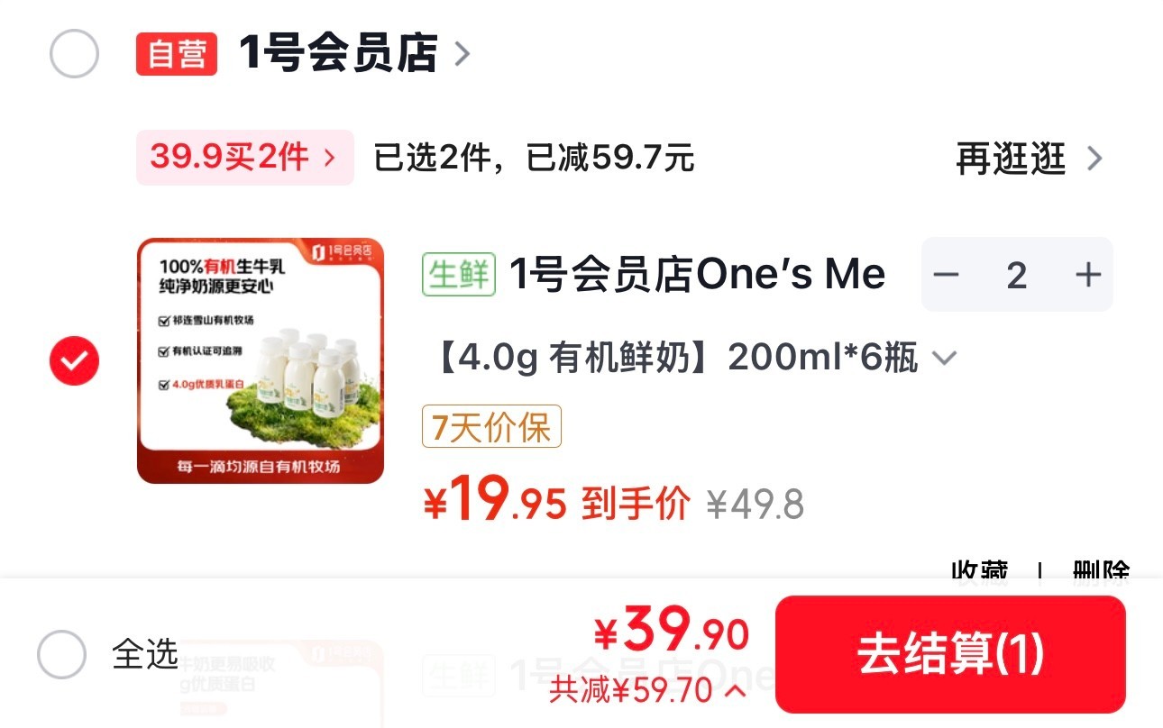 1号会员店One’s Member 有机4.0乳蛋白鲜牛奶 200ml*6瓶,任选2件【39.9】