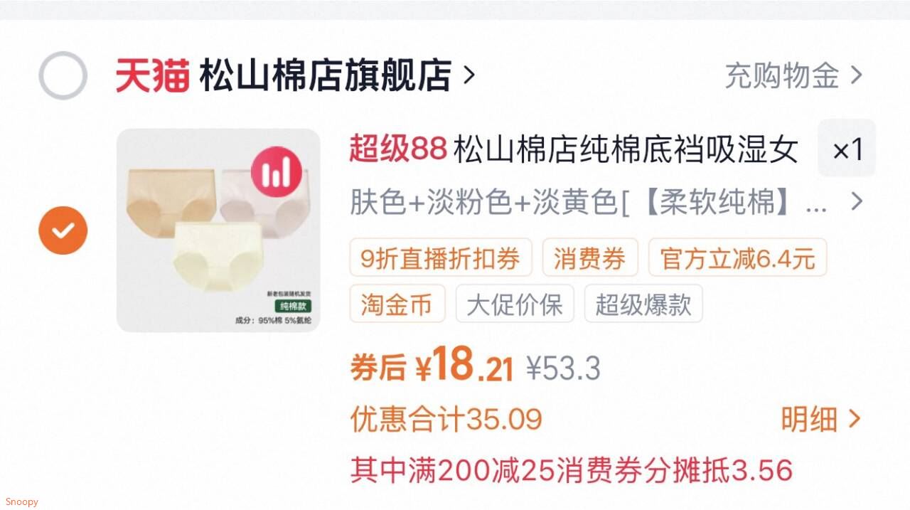 6 回购物车内裤数量改1,一起提交,折内裤到手【18.21】