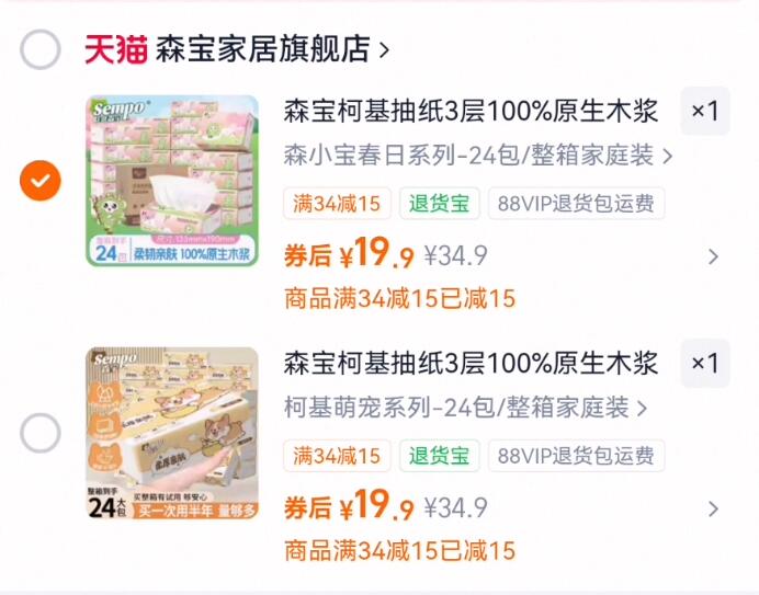 森宝加厚抽纸24包 19.9元发报员Z2026年04月15日 23:480举报 0点神圿快屯 折0.8元/包拍下19.9元!2款任选【森宝】加厚抽纸24包https://m.tb.cn/h.ipYSWc7复制文案