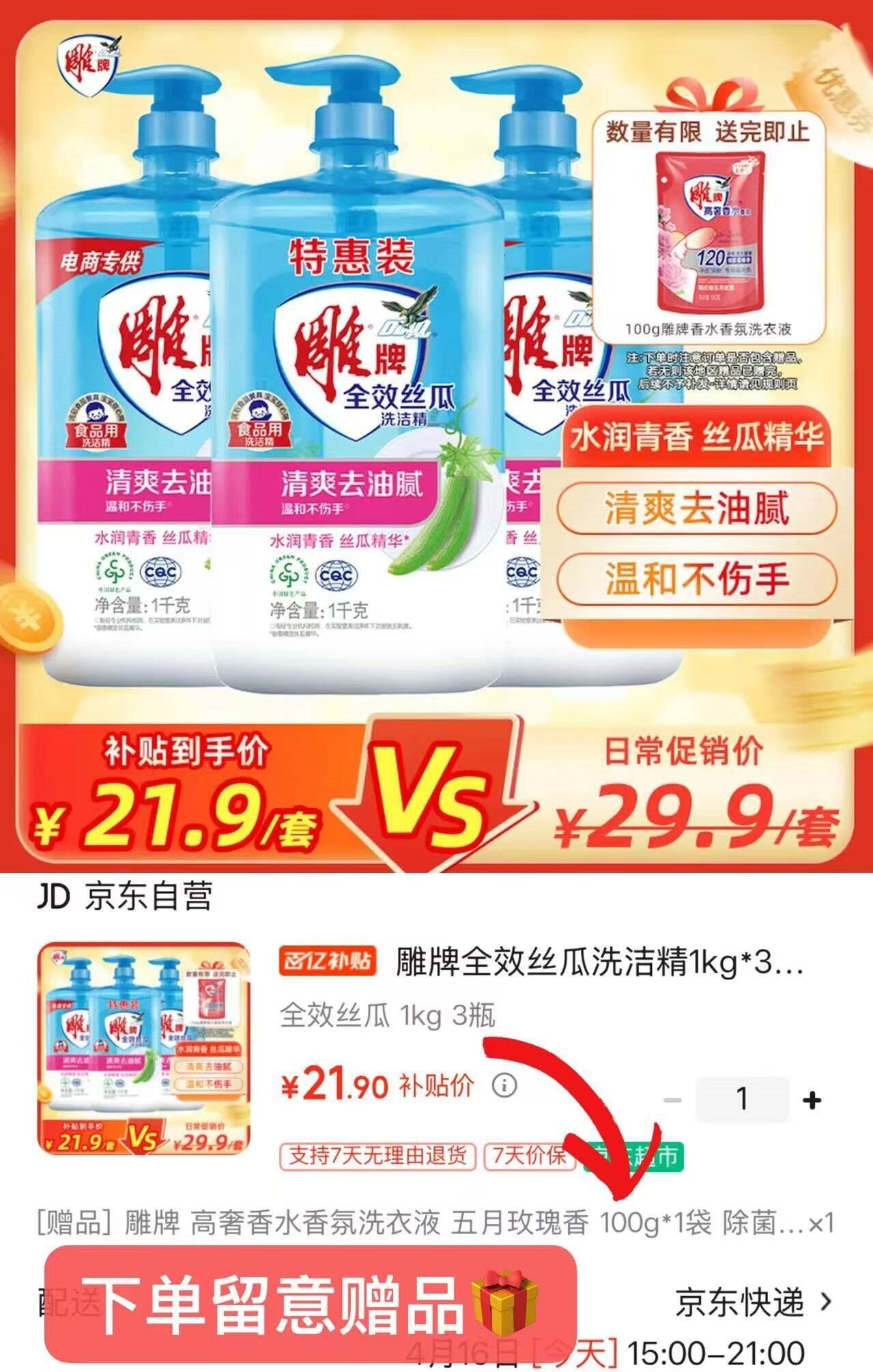 雕牌全效丝瓜洗洁精1kg*3瓶 21.9元发报员Z2026年04月16日 10:570举报 ——雕牌洗洁精发車——雕牌 全效丝瓜洗洁精1kg*3瓶https://u.jd.com/j1W2Pgd 21.9元自营包U,折7.3/瓶*贈洗衣液100g 易冲洗无残留复制文案