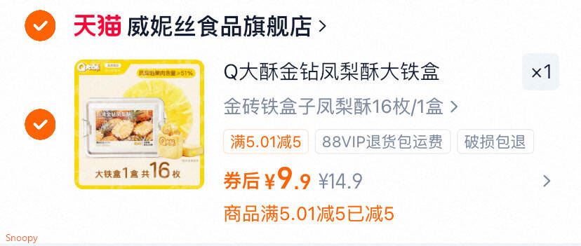 威妮丝琻钻凤梨酥16枚 9.9元发报员Z2026年04月16日 11:250举报 个数比之前多一半 还是铁盒装!咬一口超满足 折才0.6有/枚 威妮丝 琻钻凤梨酥16枚9.9元https://m.tb.cn/h.iK2r2T0复制文案
