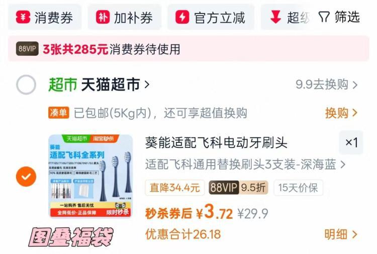 飞科电动牙刷头3支装 3.7元