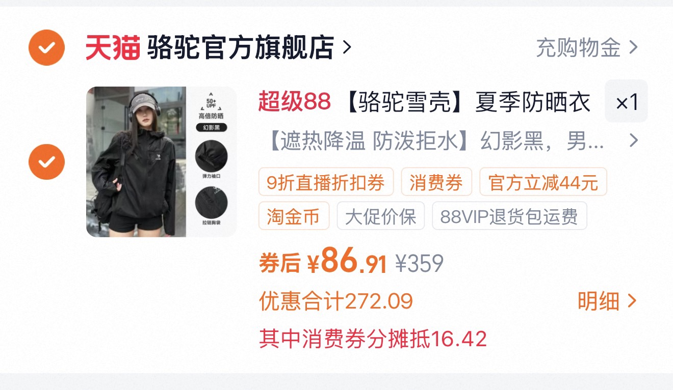骆驼雪壳夏季防晒衣外套,到手【82.77】