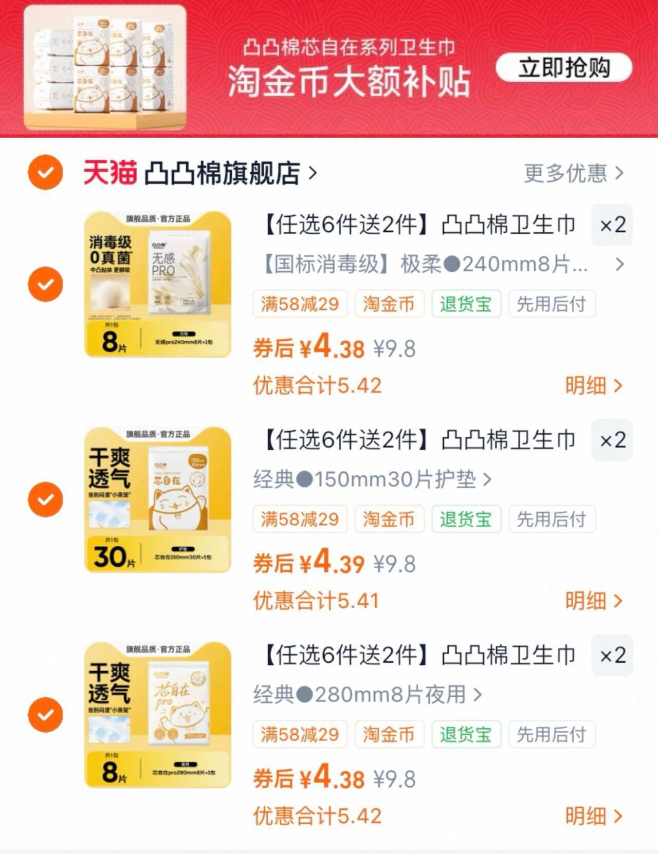 3.2/件 凸凸棉日夜卫生巾合集 任选6含贈8包 下拉26.2元发报员Z2026年04月16日 13:050举报 3.2/件 凸凸棉日夜卫生巾合集任选6含贈8包 下拉26.2元护垫/日用/夜用/安睡裤都有!https://m.tb.cn/h.iqSVT2n复制文案