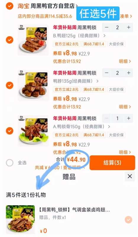 周黑鸭任选拍5件 赠1盒鸭翅尖6盒 折7.4/盒 鸭翅锁骨鸭脖通通 香卤入味发报员Z2026年04月16日 13:090举报 周黑鸭任选 拍5件 . 加贈1盒鸭翅尖 6盒 折7.4/盒鸭翅锁骨鸭脖通通 香卤入味追剧聊天整点!那叫一个享受┄https://m.tb.cn/h.iqSS3G7复制本段话到桃宝打开加勾复制文案