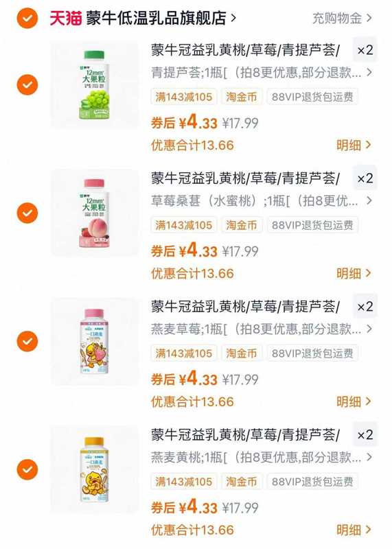 蒙牛大果粒酸奶拍8件 折4.3/瓶 叠淘金币 冠益乳/大果粒酸奶任选8件 多口味发报员Z2026年04月16日 14:040举报 蒙牛大果粒酸奶 拍8 . 折4.3/瓶 叠淘金币 冠益乳/大果粒酸奶任选8件 多口味随心选!口感丰富又丝滑 ┄https://m.tb.cn/h.ipnVn6j复制本段话到桃宝打开加勾复制文案