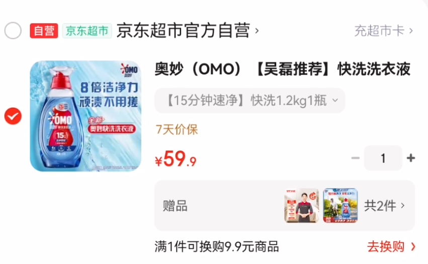 奥妙快洗洗衣液2.4斤 59.9元发报员Z2026年04月16日 14:170举报 相当于9.9元到手!按需拍拍下59.9元;赠同款*1瓶下单再赠京东家政服务2h奍家政某鱼行情50左右=9.9元【自营】奥妙 快洗洗衣液 2.4斤 https://u.jd.com/j6WkBs3复制文案