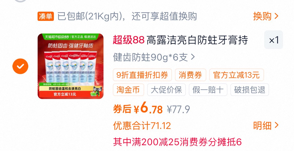 高露洁健防蛀牙膏90g*6支 6.78元发报员Z2026年04月16日 16:150举报 高露洁健防蛀牙膏90g*6支下拉详情zbj领9折加购桃金币凑消费券后6.78元https://m.tb.cn/h.iqkOAfJ凑https://m.tb.cn/h.ipYaSrq复制文案