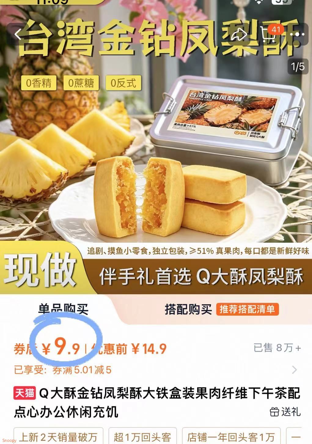 威妮丝凤梨酥Q大酥金钻凤梨酥16枚/盒 9.9元发报员Z2026年04月16日 16:360举报 9.9元,威妮丝凤梨酥Q大酥金钻凤梨酥16枚/盒个数比之前多一半 铁盒装线下随便一个五六块 快冲-https://m.tb.cn/h.iKSAeyl复制文案