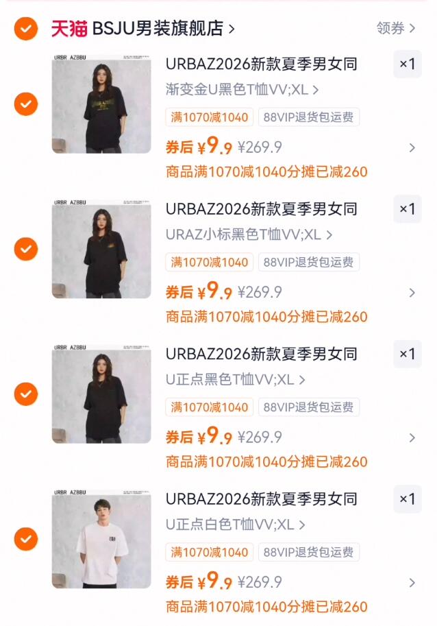 UR纯棉男女短袖T恤 任选4件 39.7元