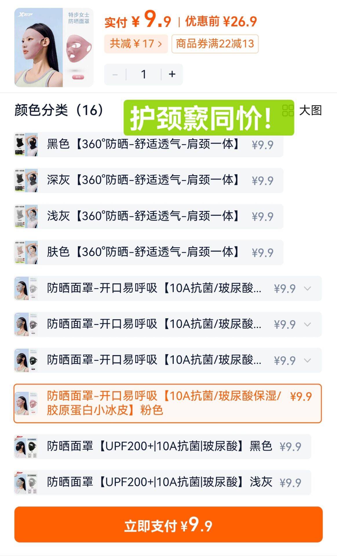 来!特步防晒面罩9.9元