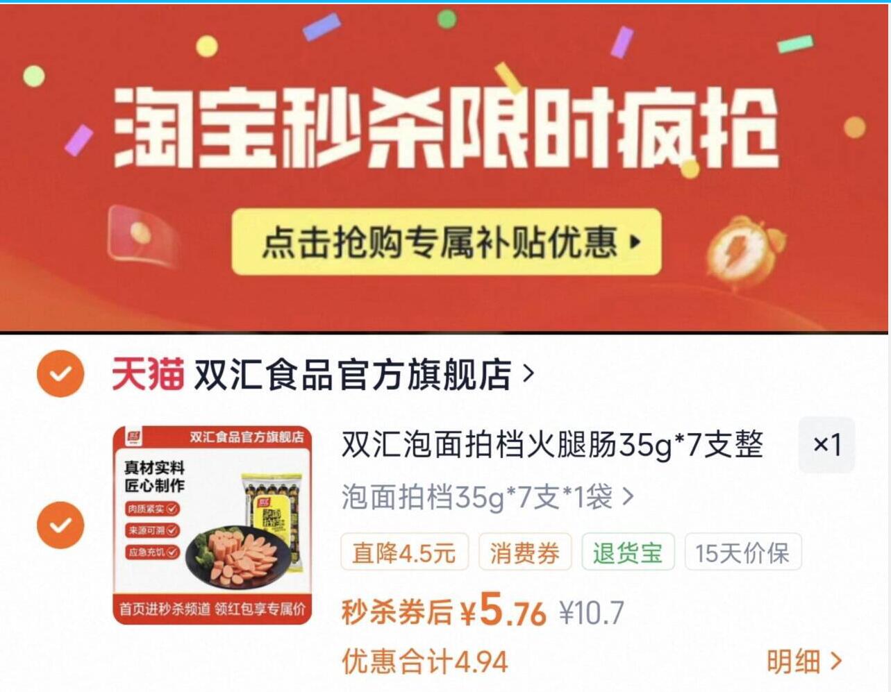 双汇泡面拍档火腿肠35g*7支 5.7元